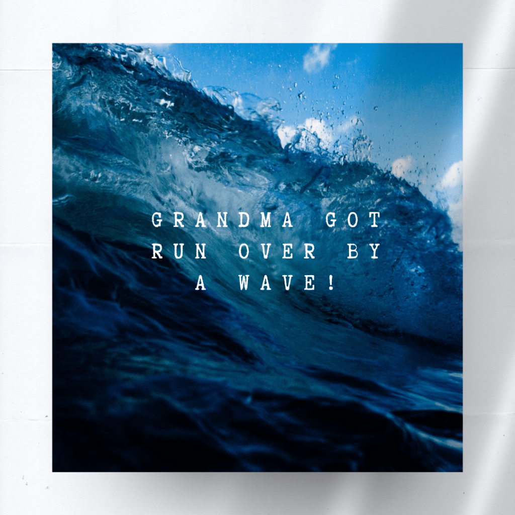 In order to help her, my dad had stayed behind. They had made good progress, but they were not quick enough. My dad and grandma had made it to where the water was at knee level when the waves caught up with them. However, the waves only toppled one human being: my grandma. My grandma plopped face down into the water… and began laughing her head off. Now, I am sure you can imagine my dad doing his very best to get his mom to her feet. My grandma, however, was no help. She just kept laughing and laughing. She tried to get up, but at that moment, another wave crashed into her and sent her once again into the water. She was LITERALLY being rolled by waves.